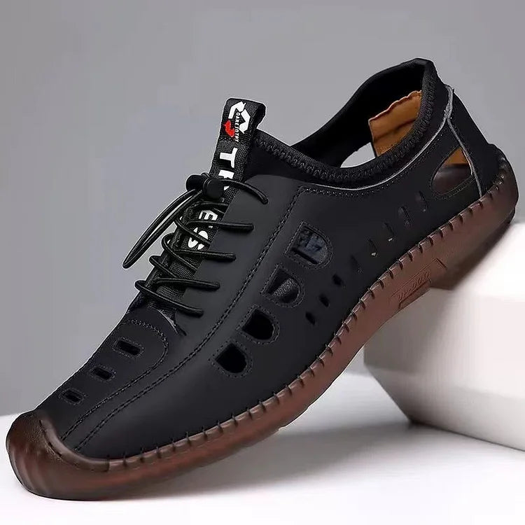Ez a pár cipő a bőr és a gumi tökéletes kombinációja. Felső része kiváló minőségű bőrből készült, mely puha, légáteresztő és könnyen karbantartható. A felső rész üreges kialakítást kapott, amely javítja a légáteresztő képességet, miközben biztosítja a lábak védelmét. Az üreges kialakítás kielégít bizonyos kültéri igényeket. A sportrajongóknak nem kell gyalogolni, mezítláb kell járniuk folyón vagy tavon való átkeléskor, ami csökkenti a véletlenszerű lábsérülések kockázatát is.