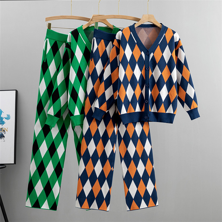 Női őszi kockás alkalmi kötött kardigán és nadrág kétrészes szett