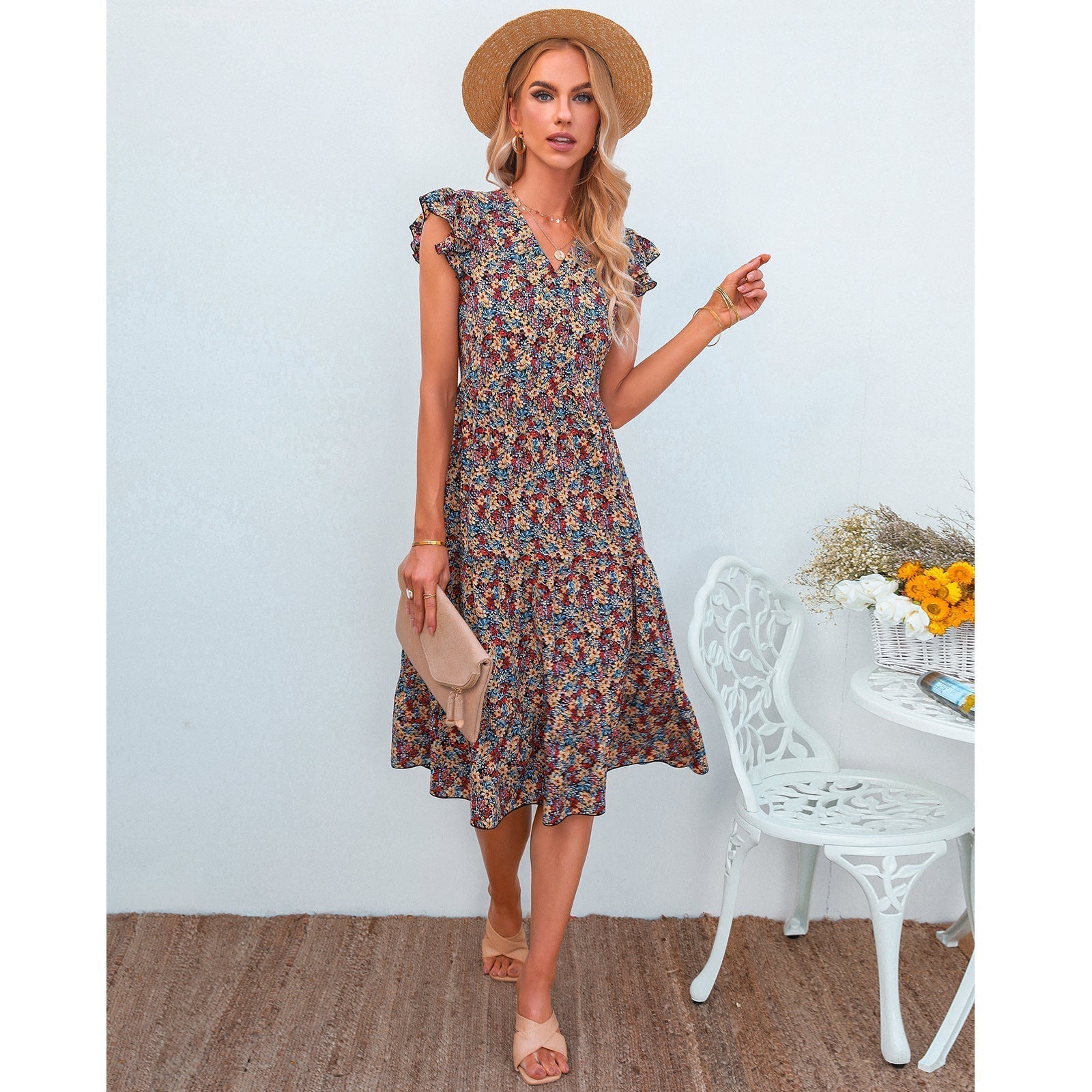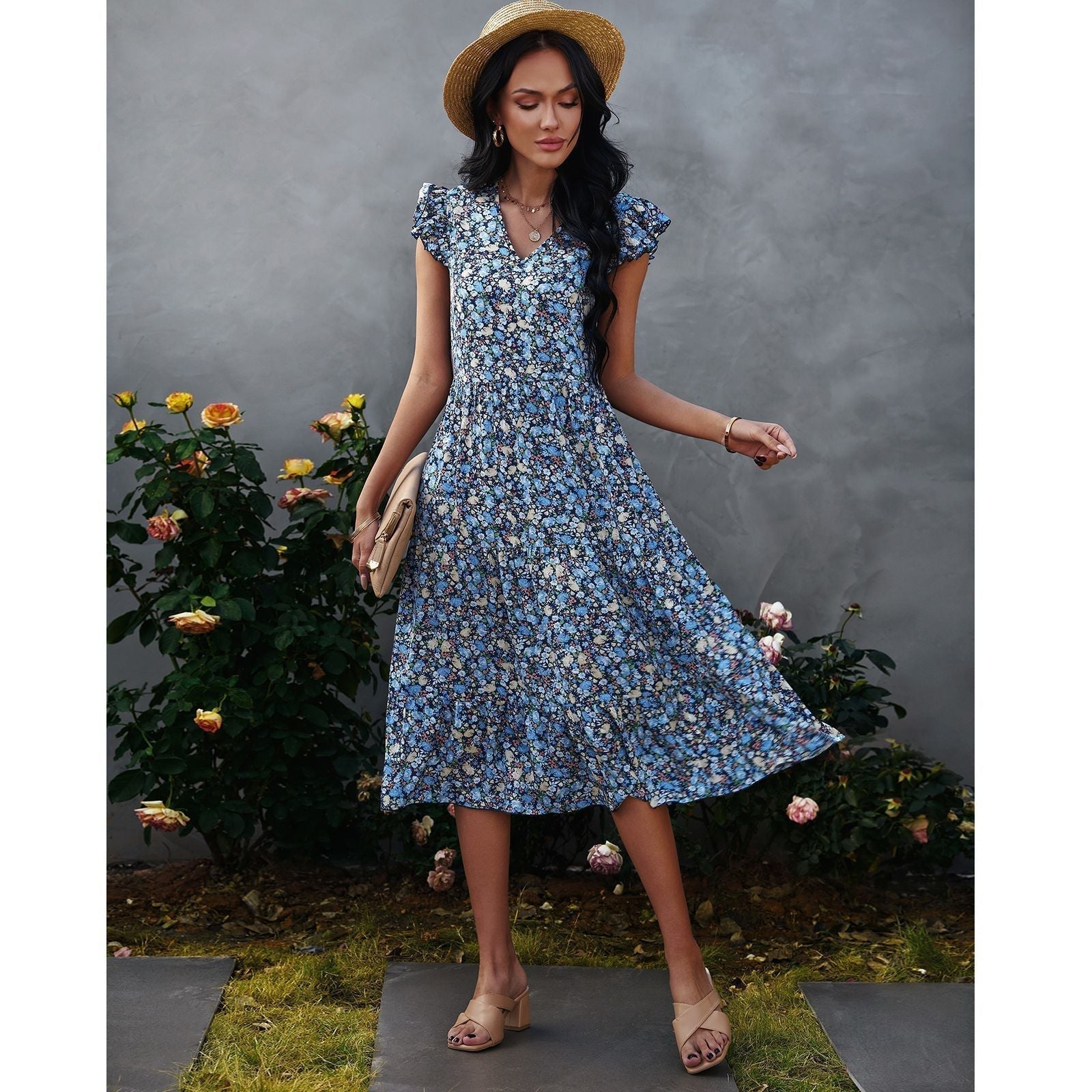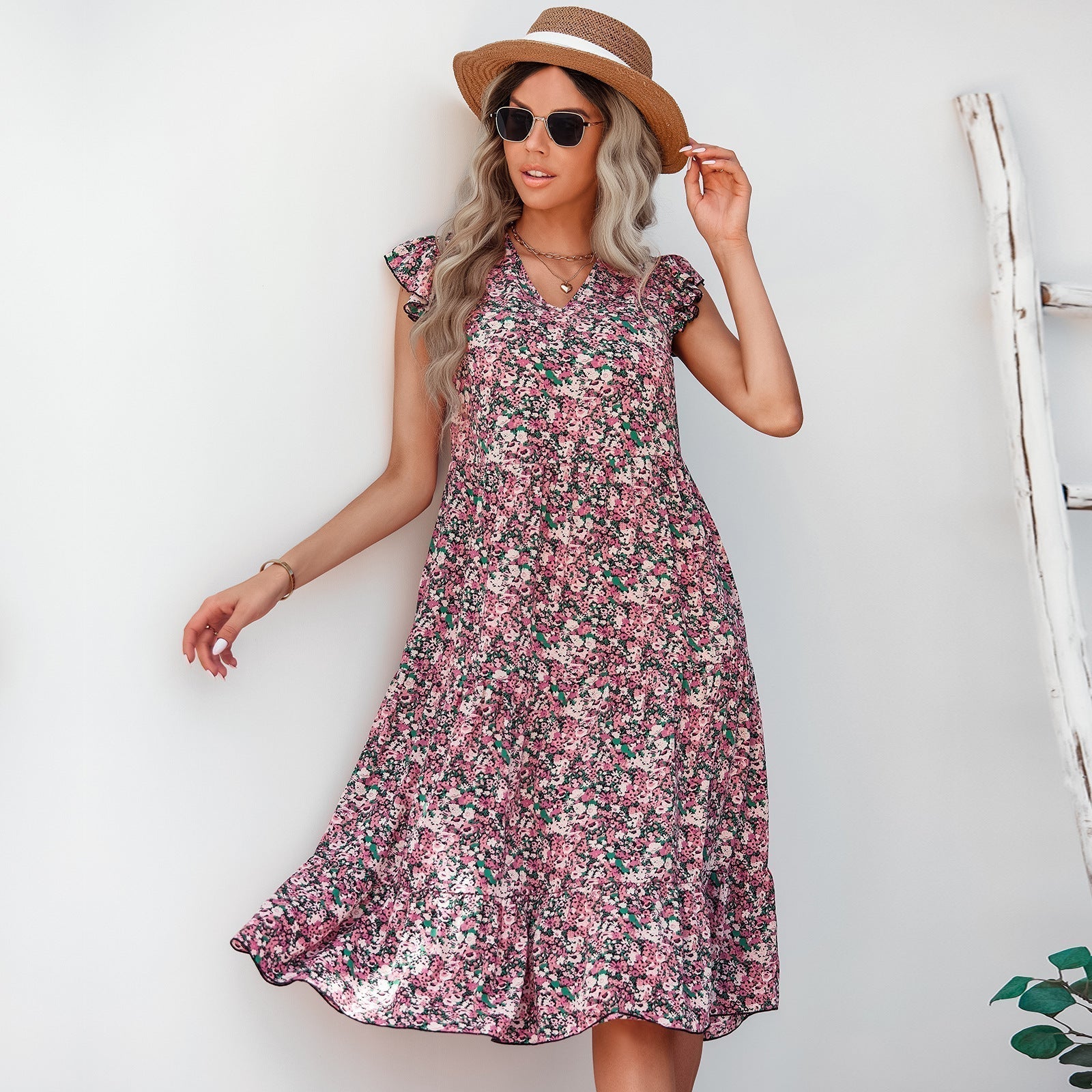 2022 nyári új V-nyakú tündérszoknya virágos ruha
