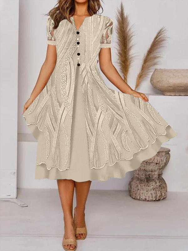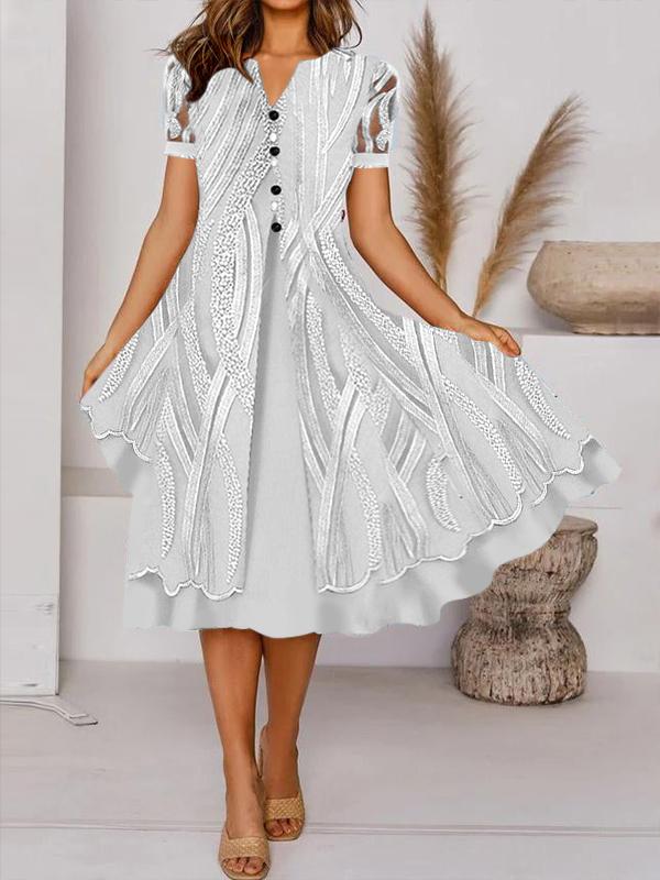 Alkalmi retro mintás V nyakú gombos rövid ujjú midi ruha