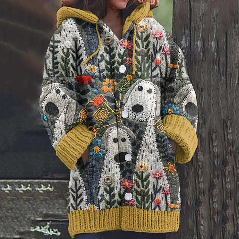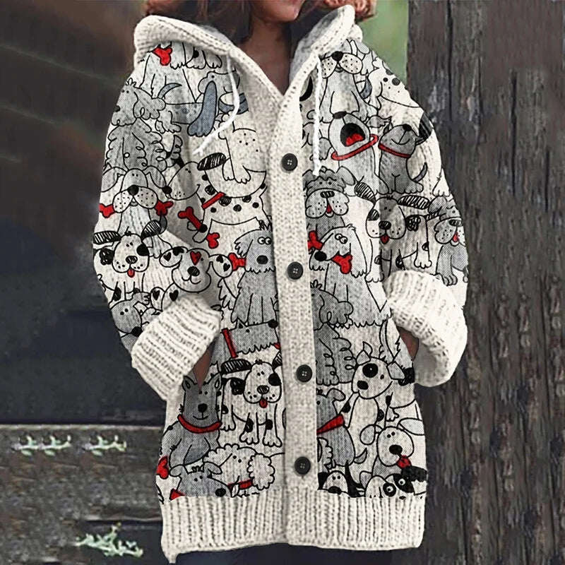 Kötött kapucnis kardigán aranyos kiskutya motívummal