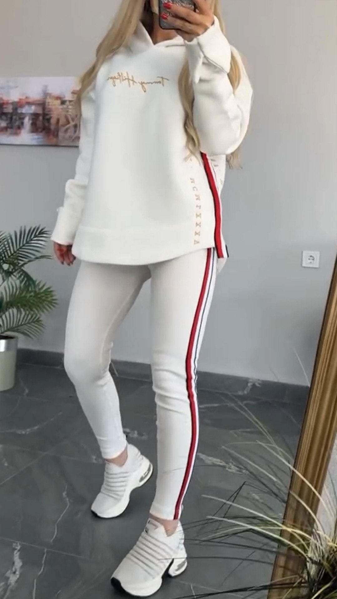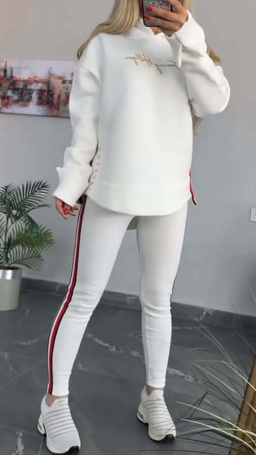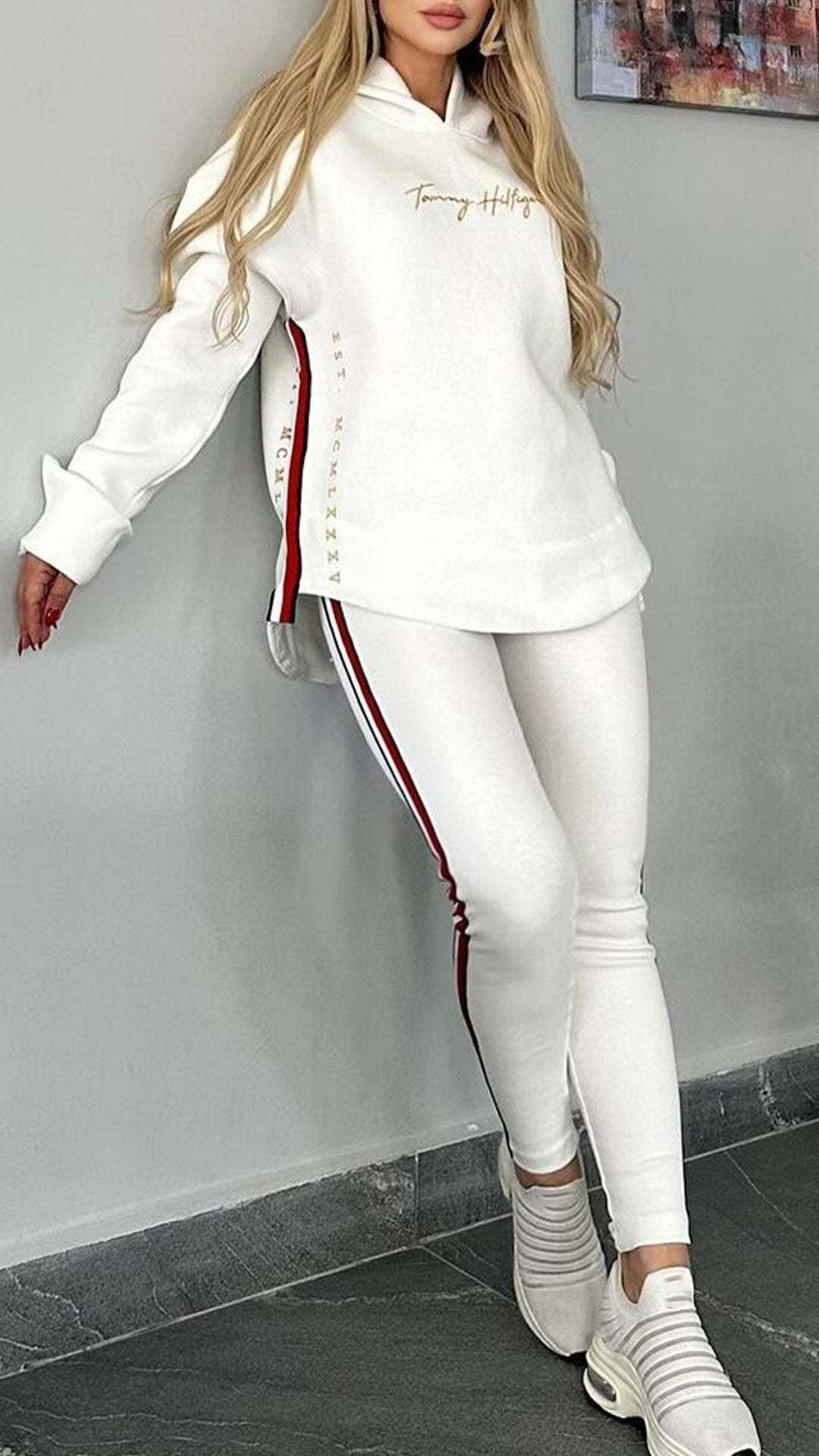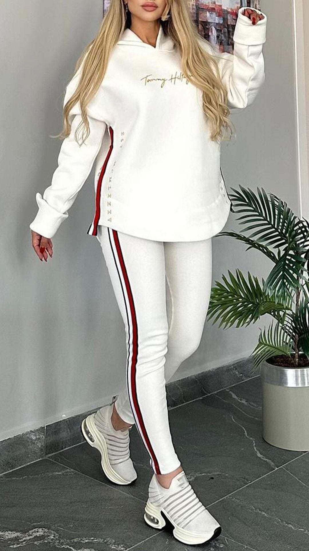 Csíkos alkalmi öltöny nőknek hosszú ujjal és kapucnival