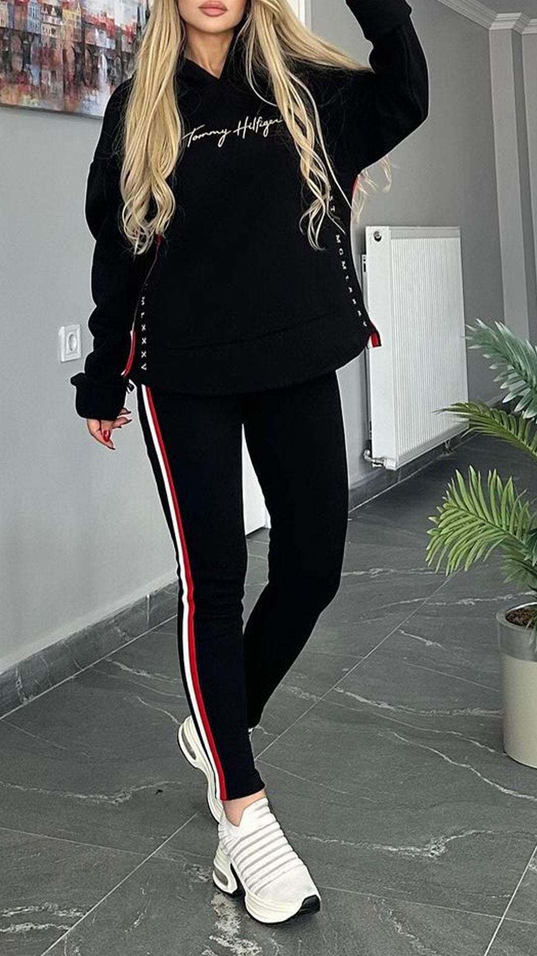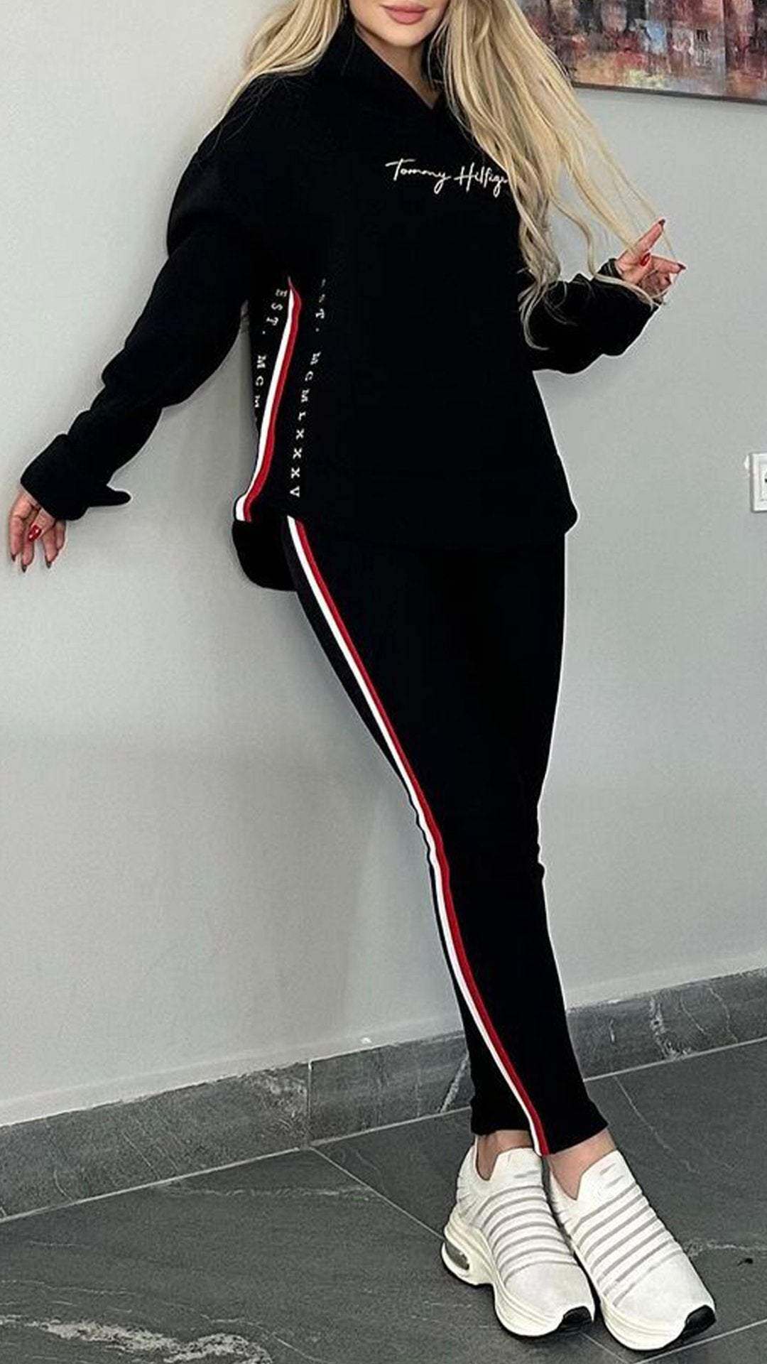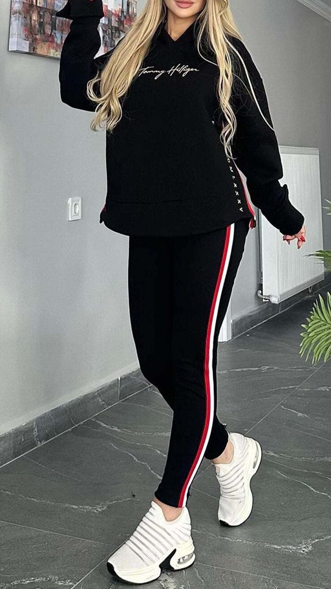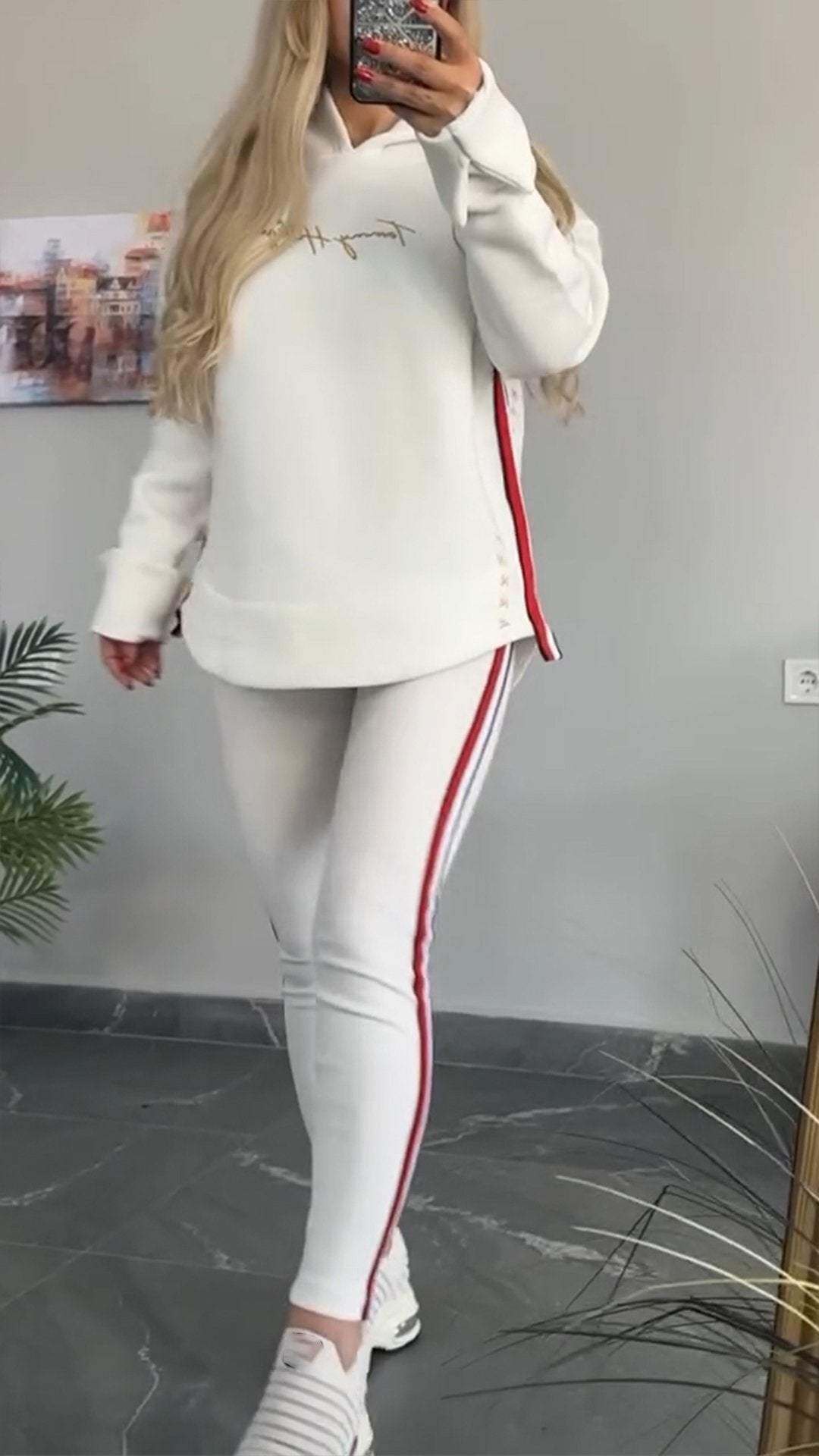 Csíkos alkalmi öltöny nőknek hosszú ujjal és kapucnival