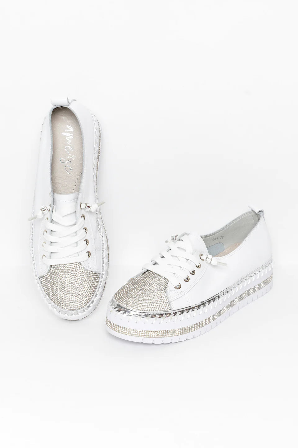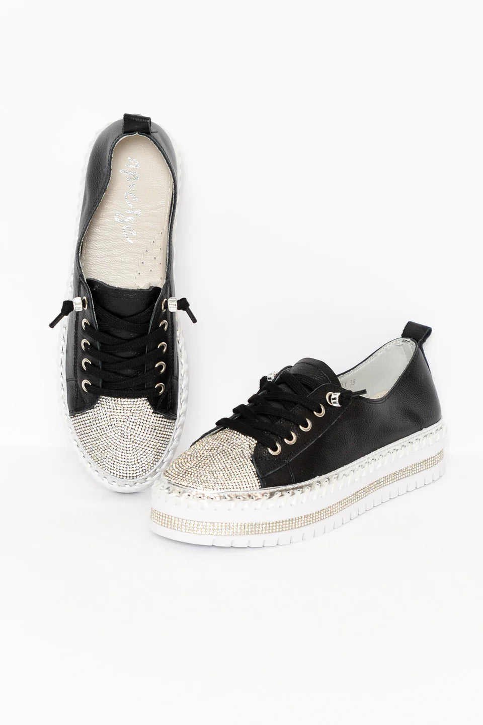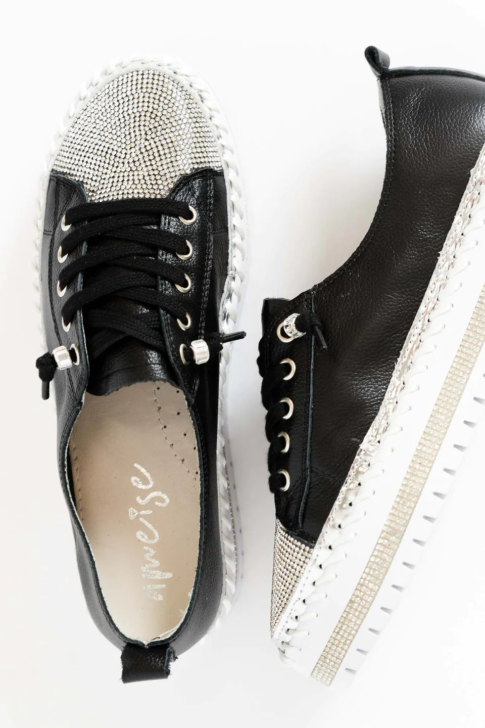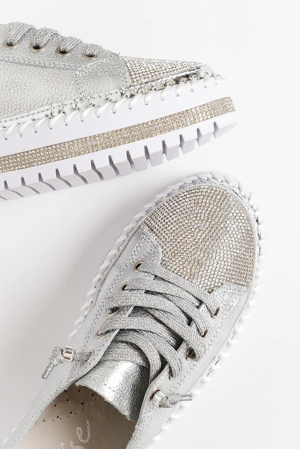 strasszcsíkok, fémes ezüst csíkok és vastag, nyitott varrások díszítik a talpat az egyedi elegáns érintés érdekében.