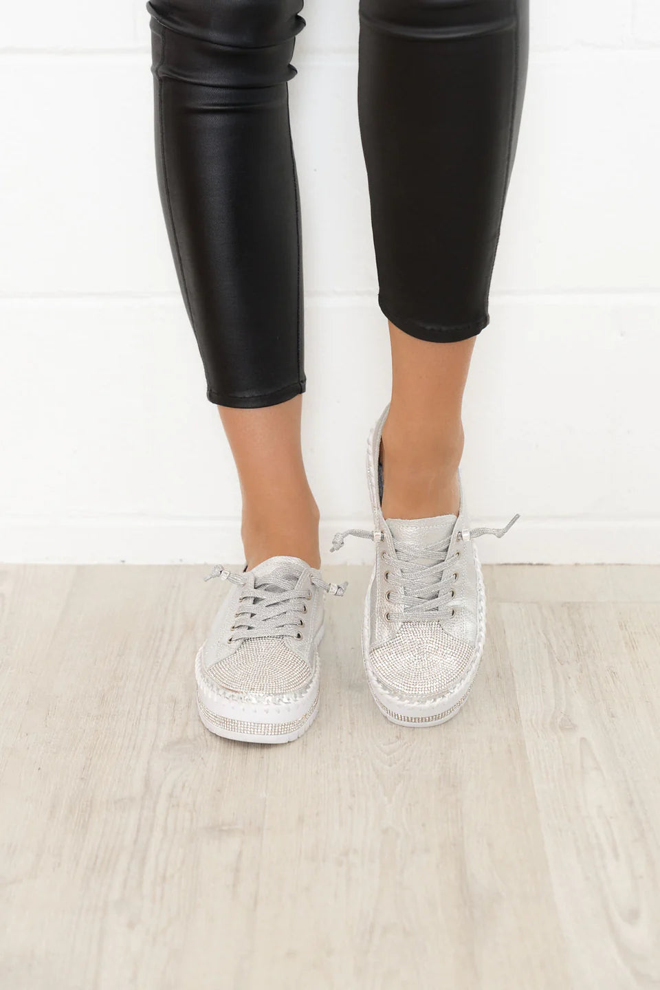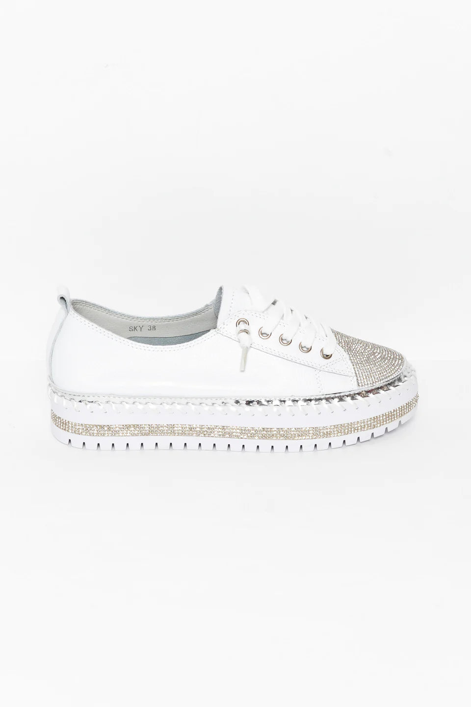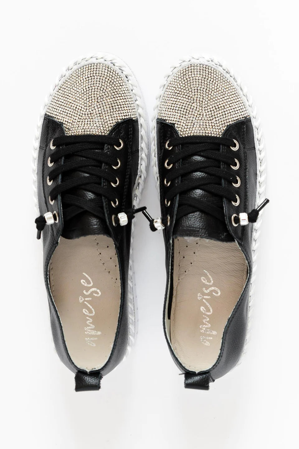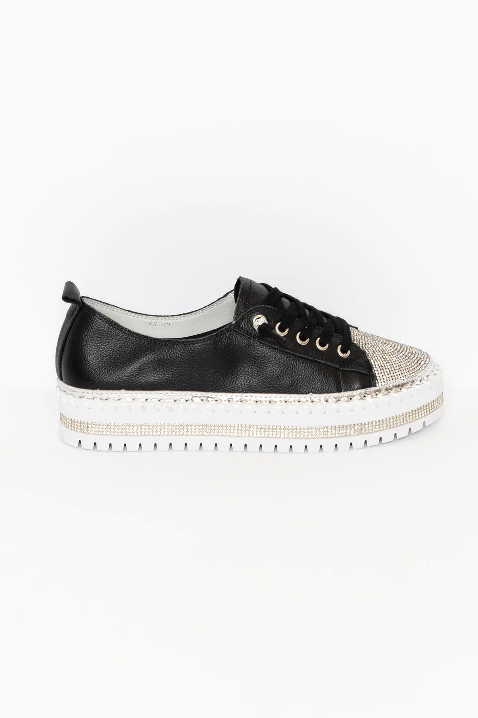 strasszcsíkok, fémes ezüst csíkok és vastag, nyitott varrások díszítik a talpat az egyedi elegáns érintés érdekében.