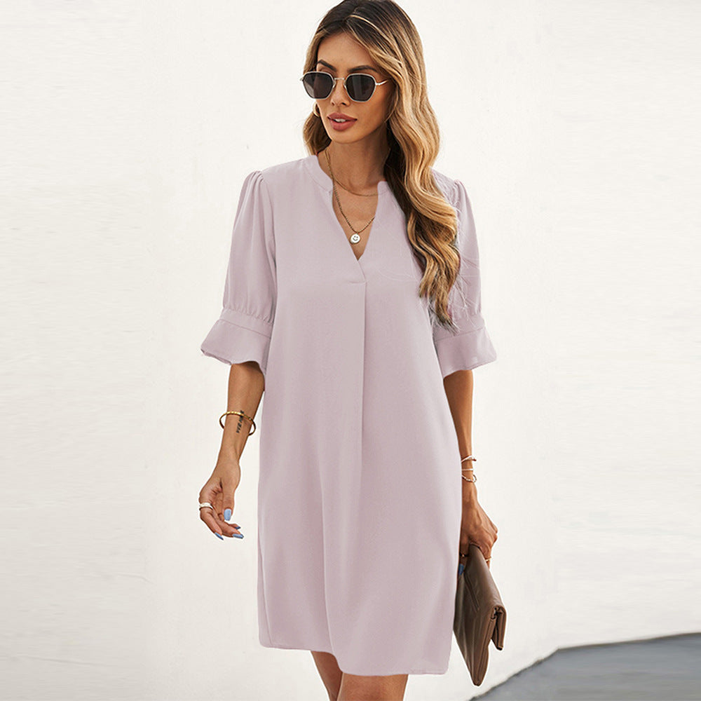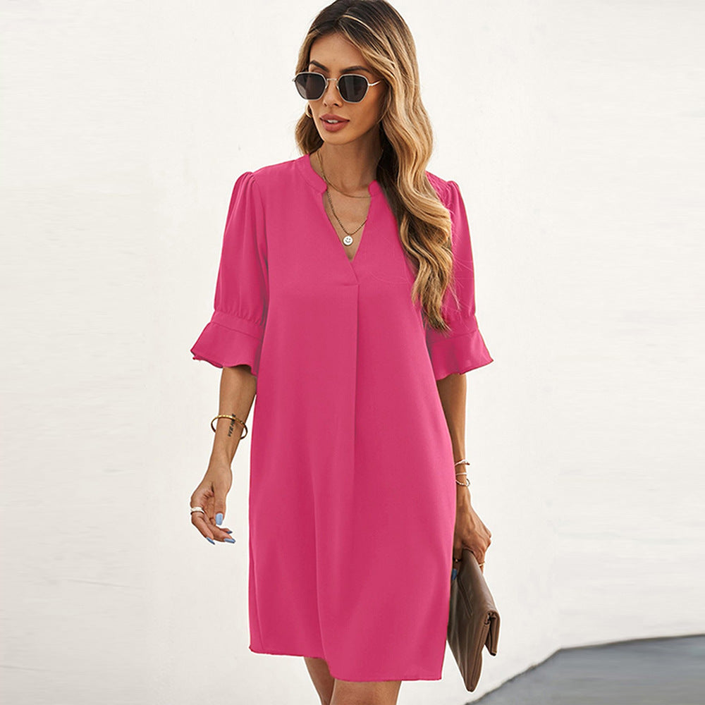 Nyári új sifon ruha női egyszínű laza alkalmi V-nyakú rövid ujjú térdig érő szoknya