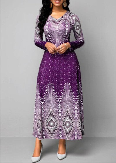 [S~5XL] 2023-as retro nyomtatású, hosszú ujjú, kerek nyakú ruha, V-nyakú