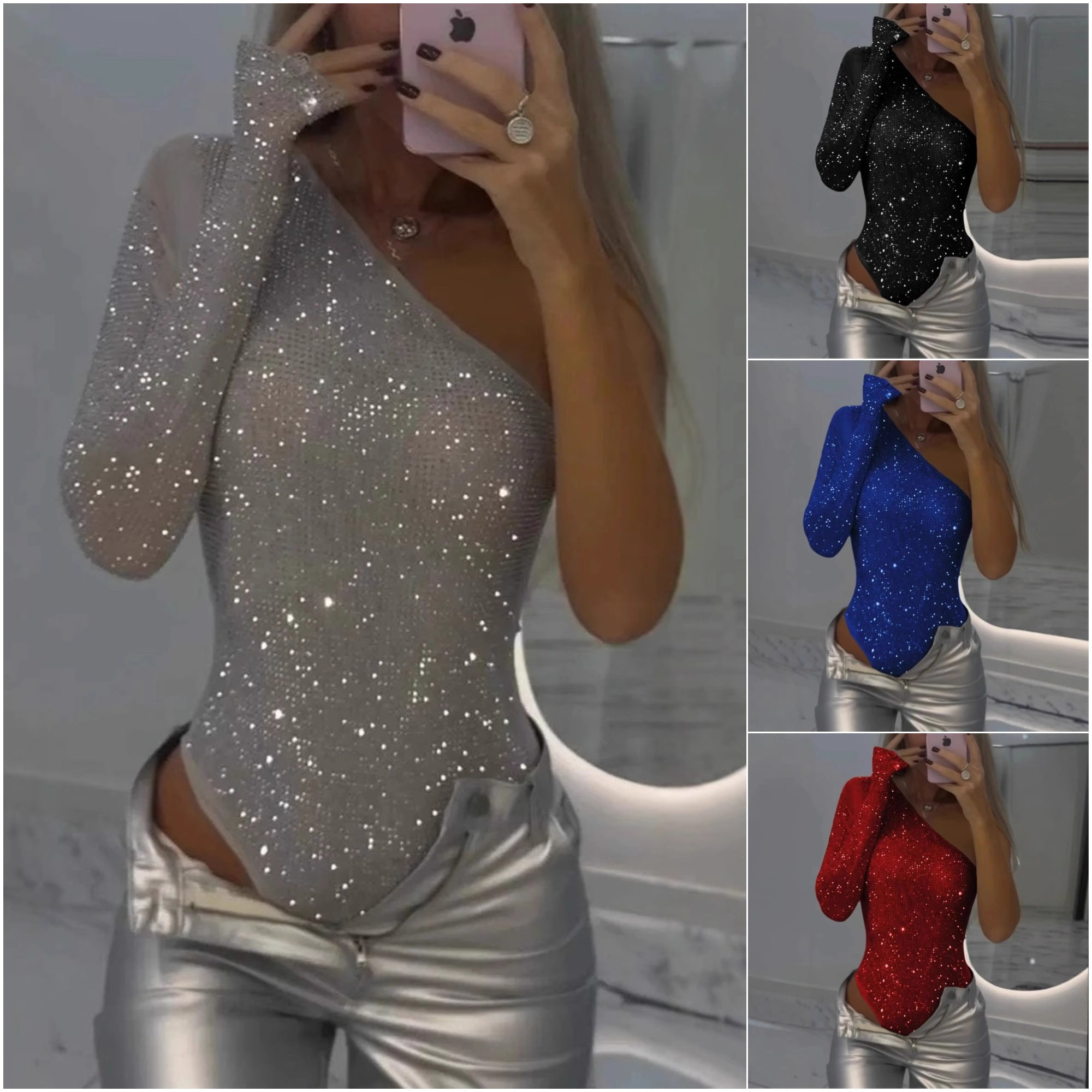 Női egy vállú, szorosan illeszkedő strassz felső