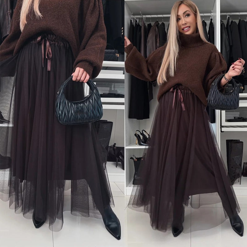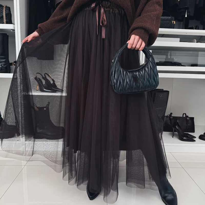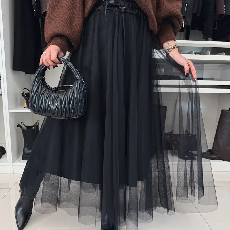 HÍZELŐ A-VONALÚ SZILHOUETT – Ez az A-vonalú tüllszoknya hízelgő formával rendelkezik, amely kecsesen folyik a deréktól a szegélyig, így időtlen, nőies megjelenést kölcsönöz. Bármilyen testtípushoz tökéletes.
