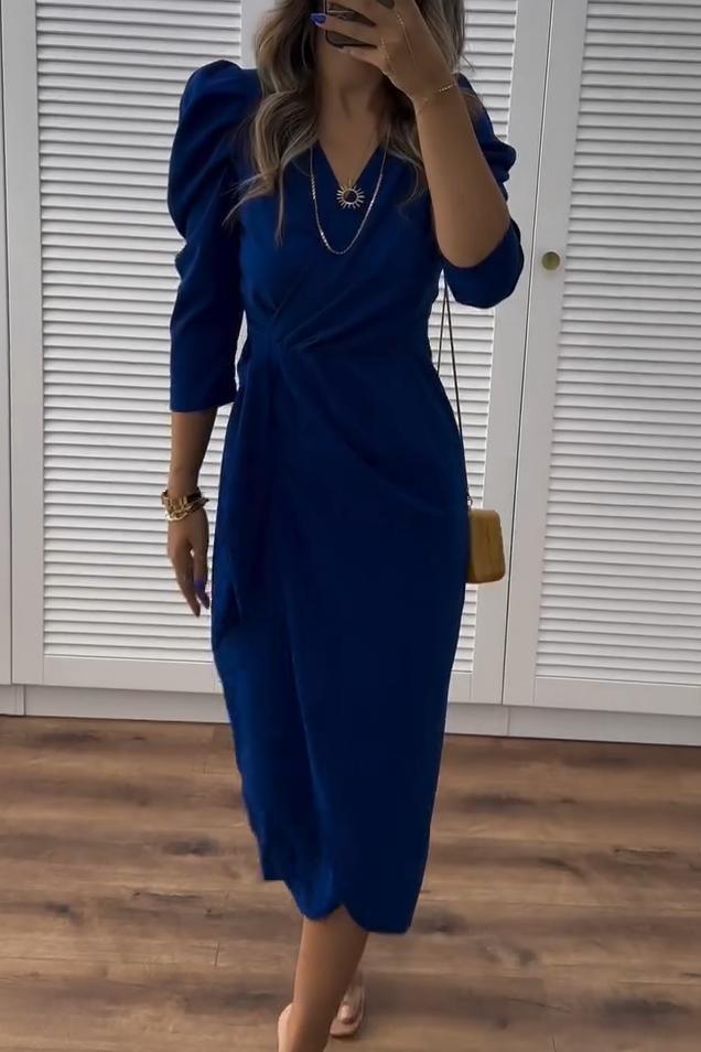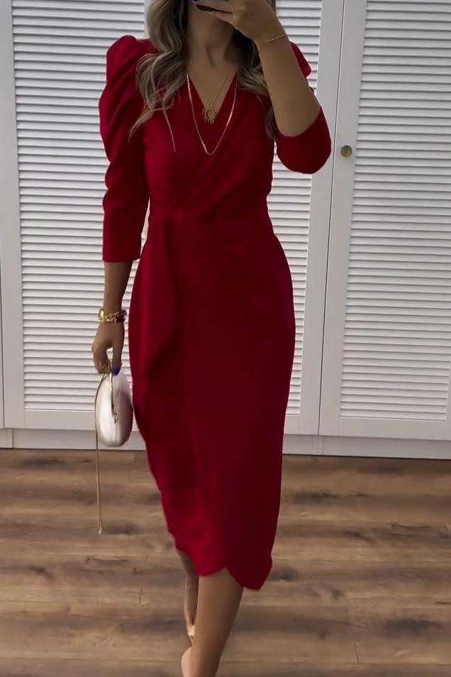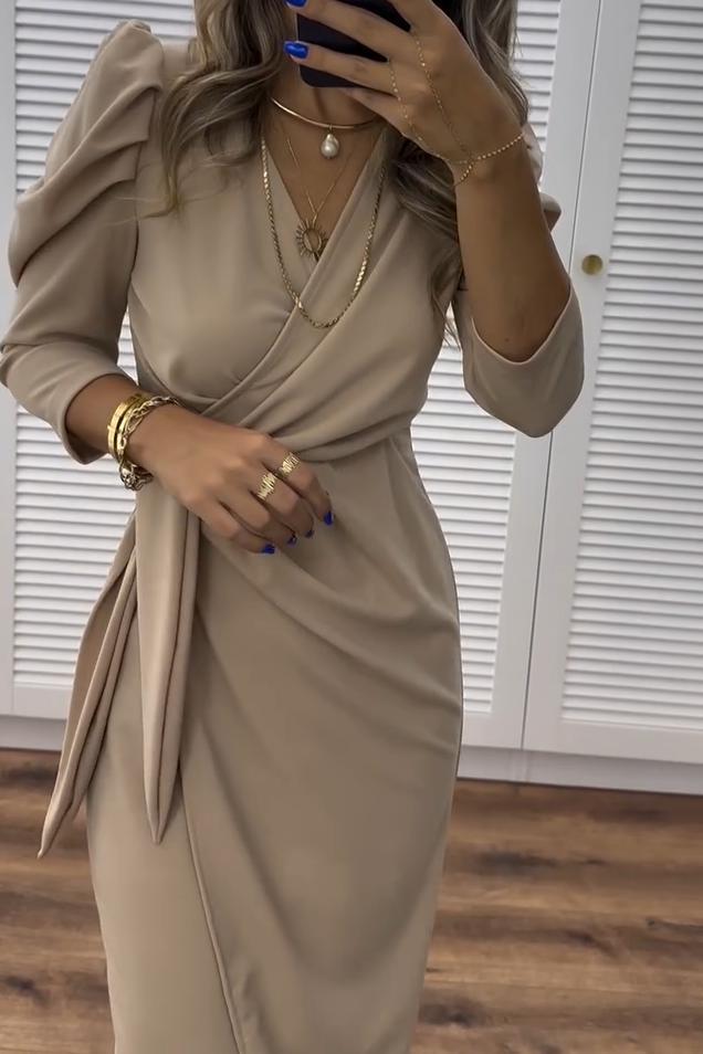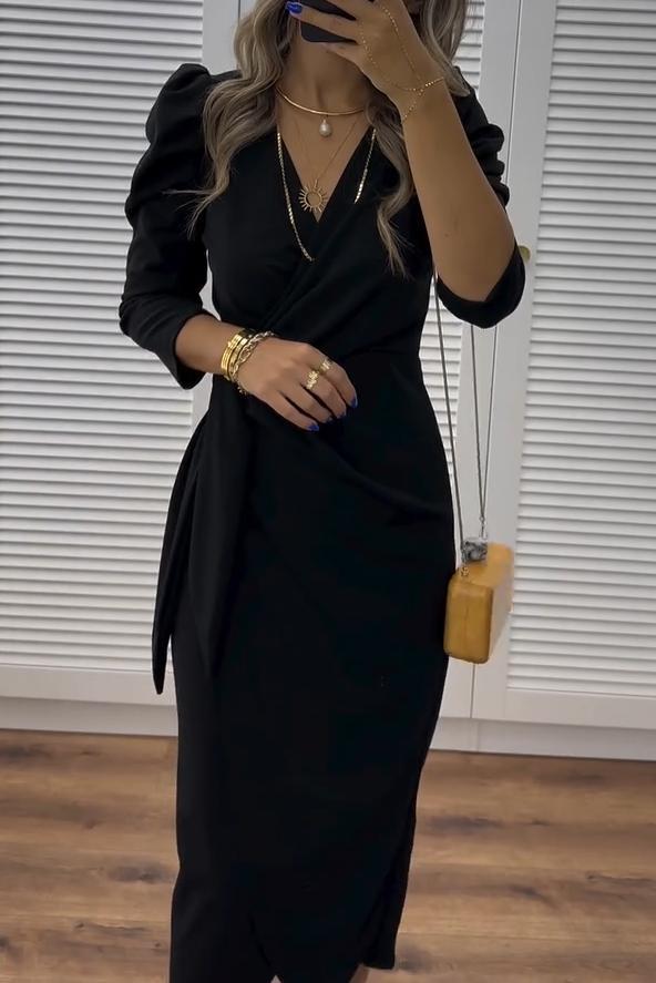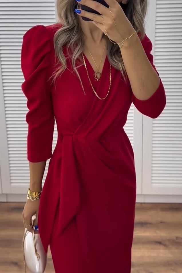 Elegáns női ruha testhezálló szabással, V-nyakkivágással