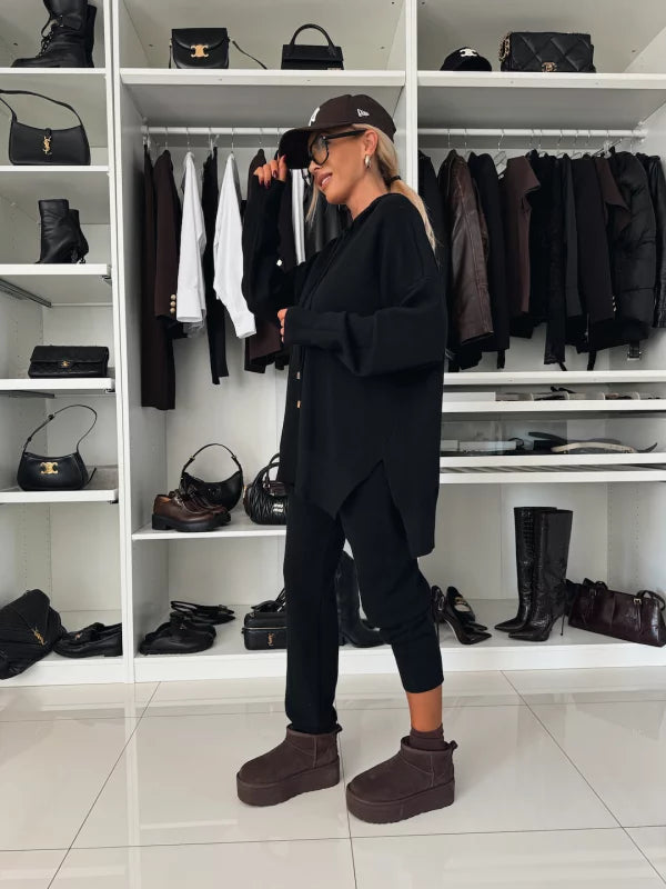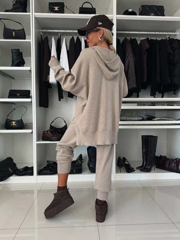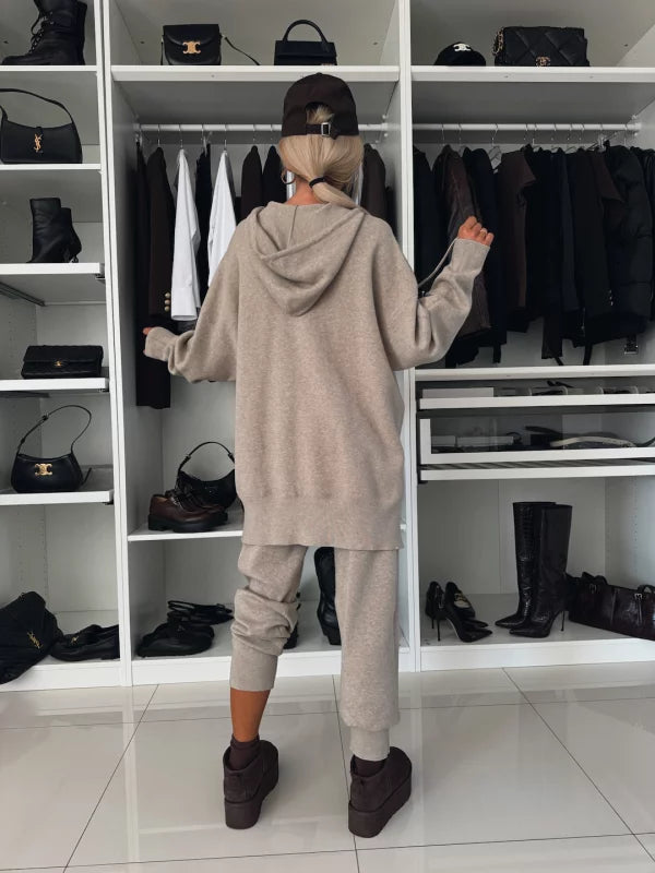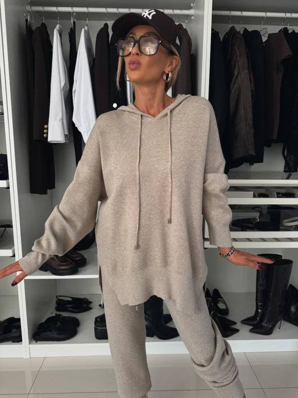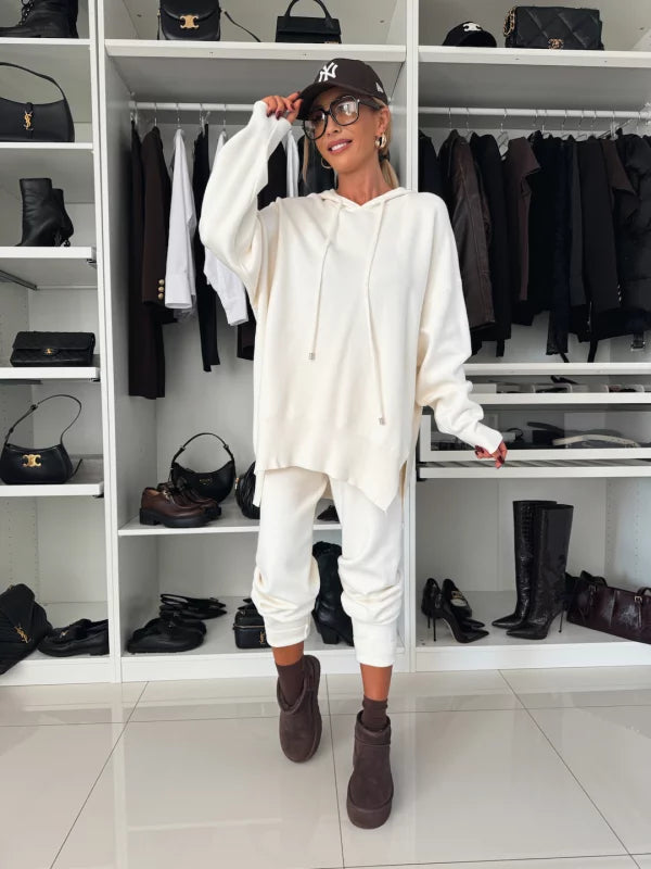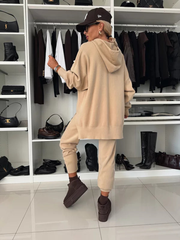 Kétrészes női szett hosszú ujjal, kapucnival és kerek nyakkal