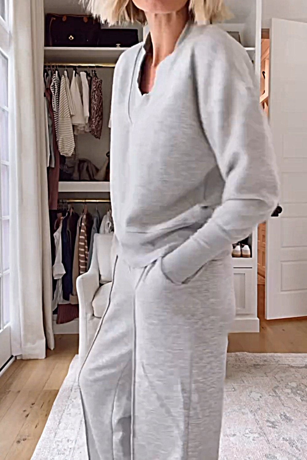 Női egyszínű V-nyakú kétrészes felső és nadrág szett