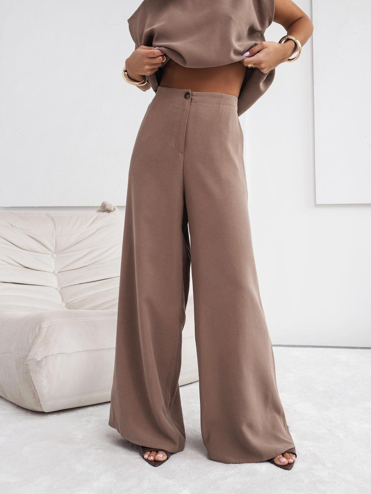 Komplett kétrészes szett - tartalmaz egy ujjatlan blúzt és egy bő szárú nadrágot. Ez egy stílusos, azonnal viselhető kombináció, amely leegyszerűsíti a ruhatárad kiválasztását bármilyen alkalomra.